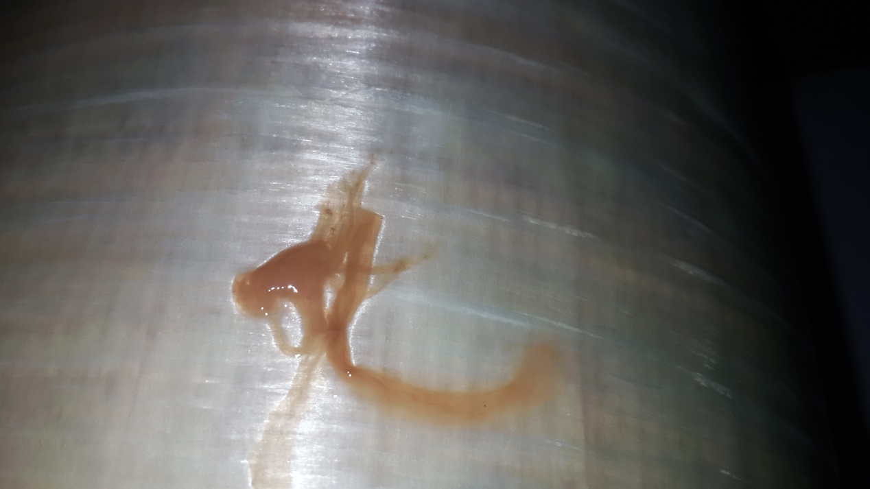 批注:近距離觀察發(fā)現(xiàn)膜的夾層內(nèi)已經(jīng)擠入較多的細(xì)砂,鐵屑,等其他固體顆粒懸浮物,這些固體顆粒一部分來(lái)自前端細(xì)砂過(guò)濾器,一部分是反滲透沖洗水和清洗系統(tǒng),這些固體顆粒一旦進(jìn)入膜內(nèi)將很難清除,特別是細(xì)砂。
